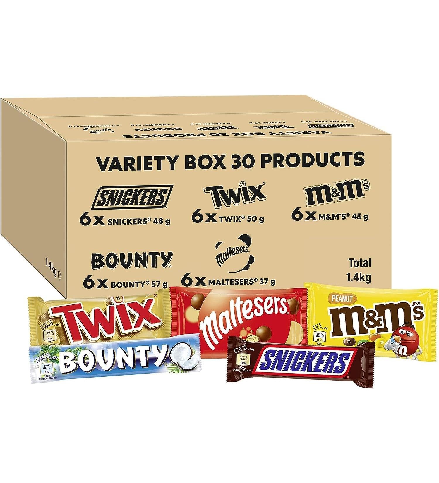 • This chocolate variety box contains 6 bars each of Snickers, Twix, Maltesers, M&M’S and Bounty. That’s 30 full-size bars which is a total of 1.4kg of chocolate.