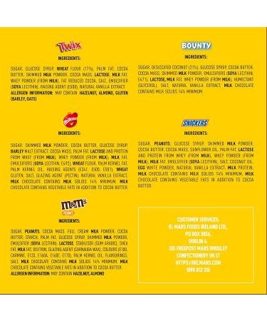 Product Description: A delicious chocolate variety box from Mars Wrigley, containing your favourite chocolates in full size! This chocolate hamper is made up of the following components: Snickers Chocolate Bars 6 x 48g, Twix Twin Chocolate Biscuit 6 x 50g, Maltesers Chocolate 6 x 37g, M&Mâs Peanut 6 x g , Bounty Twin 6 x 57g. Ingredients Milk chocolate (48 %) covered peanuts (24%) in a Sugar shell: Sugar, PEANUTS, Cocoa Mass, full cream MILK powder, cocoa butter, starch, palm fat, glucose syrup, skimmed MILK powder, emulsifier (SOYA Lecithin), LACTOSE, stabiliser (gum Arabic), Shea fat, MILK fat, dextrin, colours (E100, carmine, E133, E160a, E160e,E170),glazing agent (carnauba wax),palm Kernel oil,flavourings ,salt. (May contain: HAZELNUT, ALMOND). Milk chocolate contains milk solids 14% minimum. Milk chocolate ( 70%) with a honey-combined centre (23%) : Sugar,Skimmed MILK Powder,cocoa butter,glucose syrup ,BARLEY Malt Extract, Cocoa Mass, Palm Fat, MILK Fat, LACTOSE, Whey Permeate (from MILK), Emulsifiers (SOY Lecithin, E492), WHEAT Flour, Palm Kernel Fat, Raising Agents (E341, E500, E501), Palm Kernel Oil, WHEAT Gluten, Whey Powder (from MILK), Salt, Glazing Agent (Pectins), Vanilla Extract, Milk Chocolate contains Milk Solids 14% minimum. Moisture tender coconut covered in thick milk chocolate: Sugar, Desiccated Coconut (21%), Glucose Syrup, Cocoa Butter, Cocoa Mass, Skimmed MILK Powder, Emulsifiers (SOYA Lecithin, E471), Lactose, MILK Fat,LACTOSE, Whey Permeate (from MILK), Humectant (Glycerol), Salt, Vanilla Extract, Milk Chocolate contains Milk Solids 14% minimum. Milk chocolate (35%) with soft nougat (14%) and caramel centre (27%) with fresh roasted peanuts (24%) . sugar, PEANUTS, glucose syrup, skimmed MILK powder, cocoa butter, cocoa mass, sunflower oil plam fat, LACTOSE and protein from whey (from MILK), whey powder (from MILK), MILK fat, emulsifier (SOYA lecithin), salt, cocounut oil, EGG white powder, natural vanilla extract, MILK protein. Milk chocolate contains milk solids 14% minimum . Milk chocolate (35%) covered caramel (32%) and biscuit (26%) . Sugar, Glucose Syrup, WHEAT Flour (17%), Palm Fat, Cocoa Butter, Skimmed MILK Powder, Cocoa Mass, Lactose, MILK Fat, Whey permeate from (MILK), Fat-reduced Cocoa, Salt, Emulsifier ,(SOYA lecithin), Raising Agent (E500), Vanilla extract. May contain HAZELNUT,ALMOND,BARLEY OATS. Directions Consume as part of a balanced diet. Manufacturer Contact Information Mars Wrigley Confectionery Ltd, Dundee Road, Slough, SL1 4LG